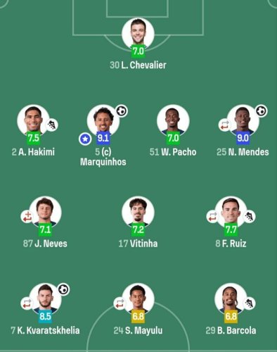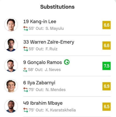 На 75-й минуте поле покинул Нуну Мендеш, уступив место защитнику ПСЖ и сборной Украины Илье Забранию. 23-летний футболист получил от экспертов оценку 6,9 баллов.